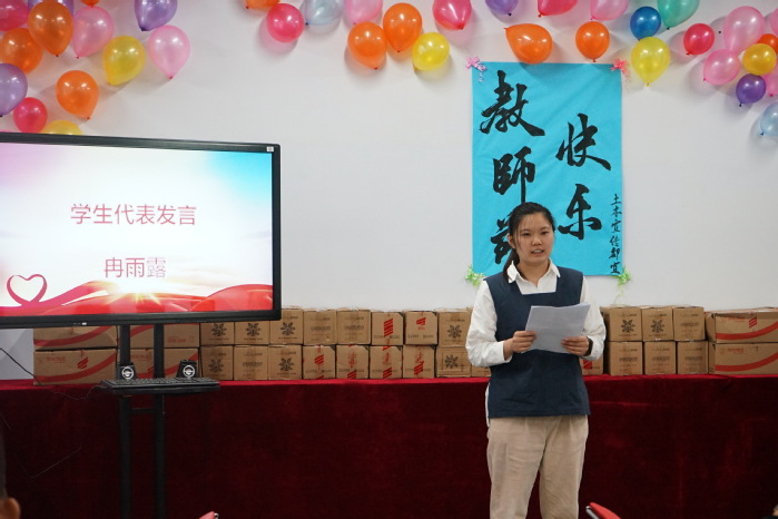 有着多年教学经验并经历过36个教师节的周显波老师在发言中祝福大家节日快乐,并寄语年轻教师在平凡的三尺讲台上成就不平凡的事业。获奖教师代表周欢老师发言时表示要珍惜荣誉,继续努力,更好的服务学生。建1707班冉雨露同学代表学生为教师送上了真挚的祝福。她的一番感情真挚的发言,引得在场教师热泪盈眶,老师们不仅为自己的付出得到学生的感激而感动,更为自己从事的高尚职业而骄傲自豪。