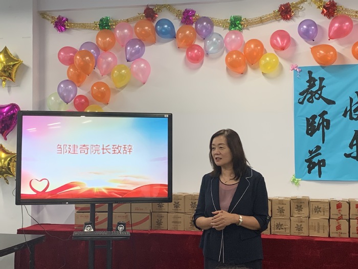 校长助理兼土木工程学院院长邹建奇为获奖教师颁发奖品,并致辞表示,感谢全体教职工在今年这个特殊时期里对学院各项工作作出的努力及辛勤付出,并对大家取得的成绩表示祝贺。她总结了学院在疫情期间的工作状态,对全体教职工提出殷切希望并送上节日的祝福,勉励大家要在平凡的工作岗位上,尽职尽责,教书育人,做一名合格教师,努力为教育事业作出新的更大贡献。