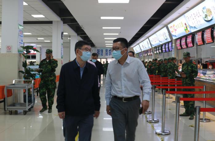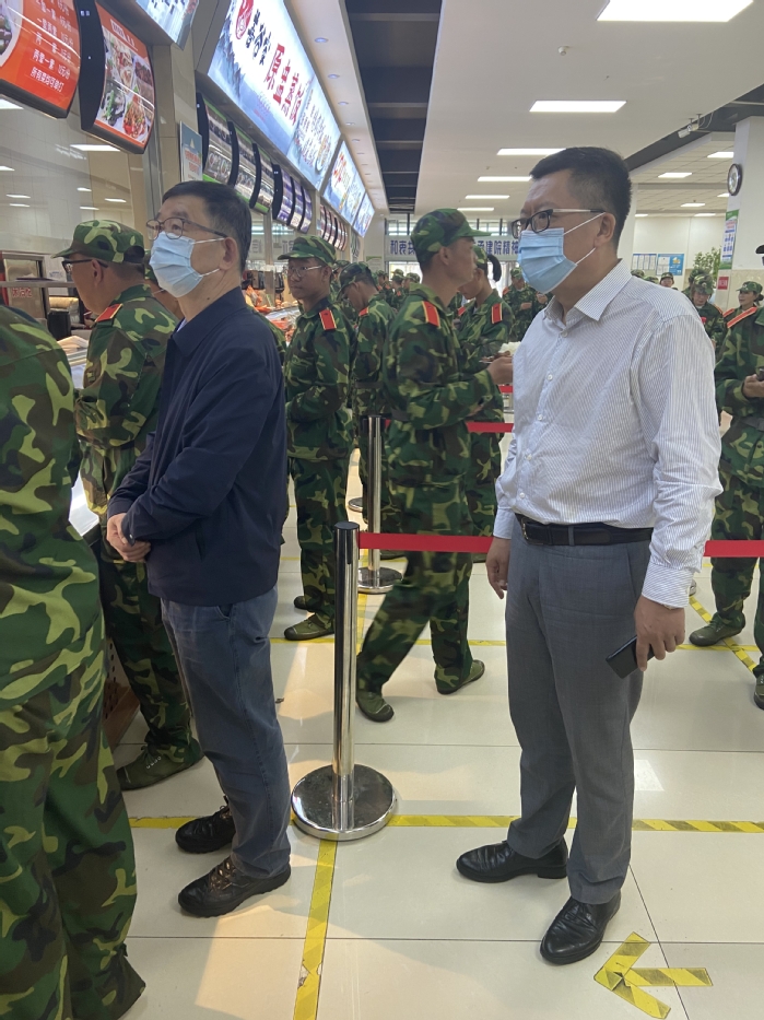 战高峰一行到达学校后,在学校领导的陪同下,率先来到学校第一食堂,主动接受测温后在食堂内驻足了解餐厅分散就餐情况。