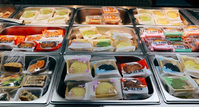 当然,中秋节月饼是必不可少的,第一食堂的阿姨还贴心的将所有在售的月饼切成两瓣,让每种口味的月饼馅都能清晰可见,所见即所得,任君选择。