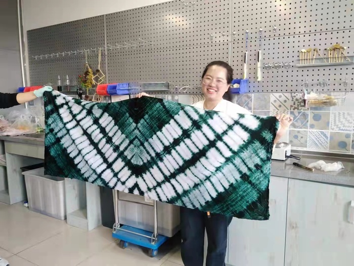 在温馨友好的氛围中,参加活动的老师们一一完成了自己的扎染作品,大家相互展示,脸上洋溢着自信和幸福的笑容。
