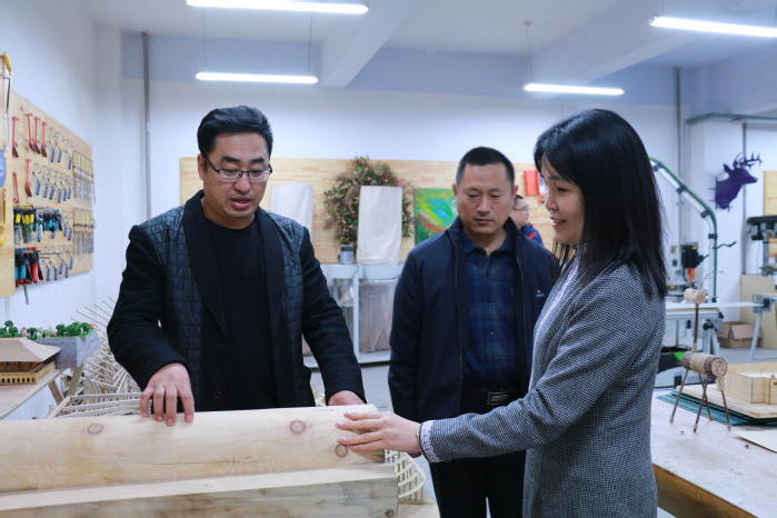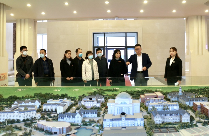 慈建华一行还参观了学校的沙盘展示区、政务服务大厅、大学生社团活动中心、现代教育信息中心、民革党员之家图书室、国际会议中心、公共艺术学院创意街区以及建筑与规划学院实训空间等。