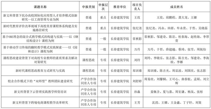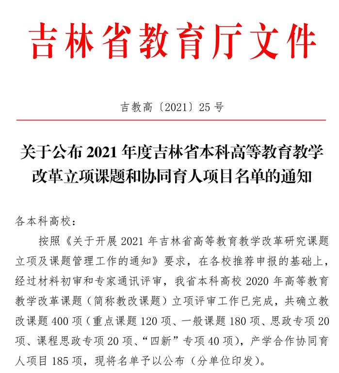 近日,吉林省教育厅公布2021年度本科高等教育教学改革立项课题和协同育人项目名单,学校共有9项课题获批准立项,其中教改课题6项(重点课题2项、一般课题2项、课程思政专项2项)、产学合作协同育人项目3项。