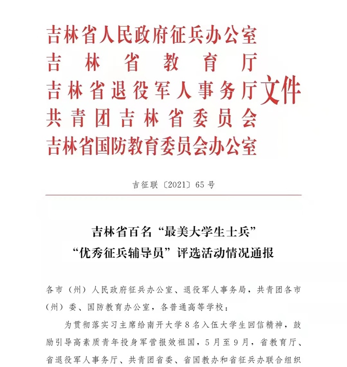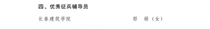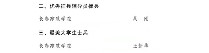 为贯彻落实习主席给南开大学8名入伍大学生回信精神,鼓励引导高素质青年投身军营报效祖国,2021年5月至9月,省教育厅、省退役军人事务厅、共青团省委、省国教办和省征兵办联合组织开展了吉林省百名“最美大学生士兵”“优秀征兵辅导员”评选活动。评选活动得到了全省66所高校积极响应,在社会各界引起了广泛关注,激发了高校学子热爱祖国、热爱军队、关心国防、献身国防的使命意识和责任担当。经过评选,学校文化创意产业学院党总支副书记吴刚荣获“优秀征兵辅导员标兵”称号;学校城建学院辅导员郭娟荣获“优秀征兵辅导员”称号;学校交通学院交通工程专业1801班学生李旺林荣获“最美大学生士兵标兵”称号;学校城建学院建筑环境能源与应用工程专业1801班学生王新华荣获“最美大学生士兵”称号。