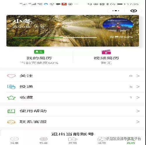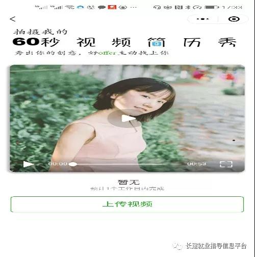 关注学校就业微信公众号“长建就业指导信息平台”,点击“视频就业-个人中心“,进入学校就业小程序。