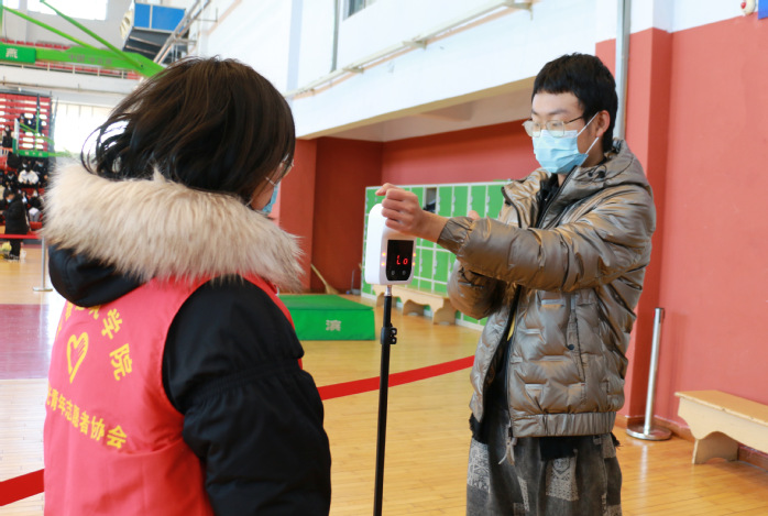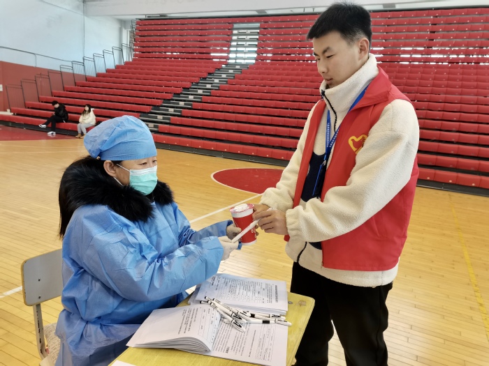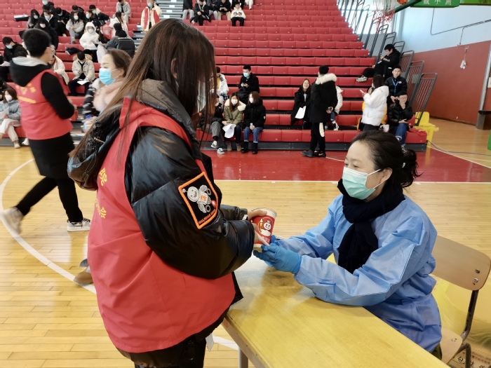 在现场维持秩序的老师发现不少医务人员自带的热水已经喝光,便为医务人员们买来了热奶茶。当志愿者将一杯杯热乎乎的奶茶递到医务人员手中时,师生们的敬意与医务人员的感谢,碰撞在相视一笑的交接里,和谐有爱的氛围弥漫在整个篮球馆中,为这一次的接种工作凭添了一分暖意。
