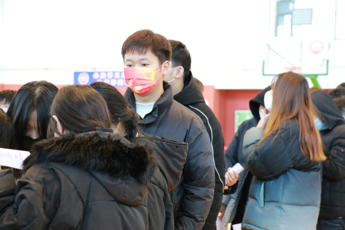 此次新冠疫苗加强针集中接种点设置在学校篮球馆,24日一早,符合接种条件、有接种意愿的师生就在篮球馆入口处按照次序集结等候,在经过查验“吉祥码”、测温等程序后,依次进入场馆等候区。