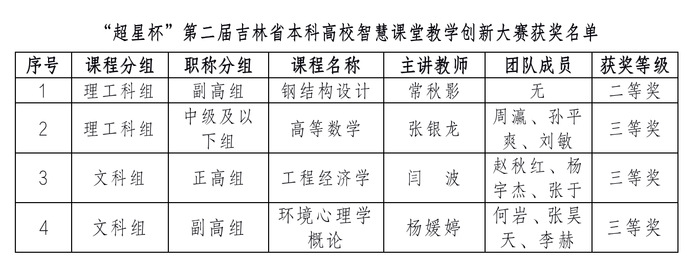 日前,吉林省教育厅公布了“超星杯”第二届本科高校智慧课堂教学创新大赛获奖名单,学校四位参赛教师及其团队获得二等奖1项、三等奖3项。