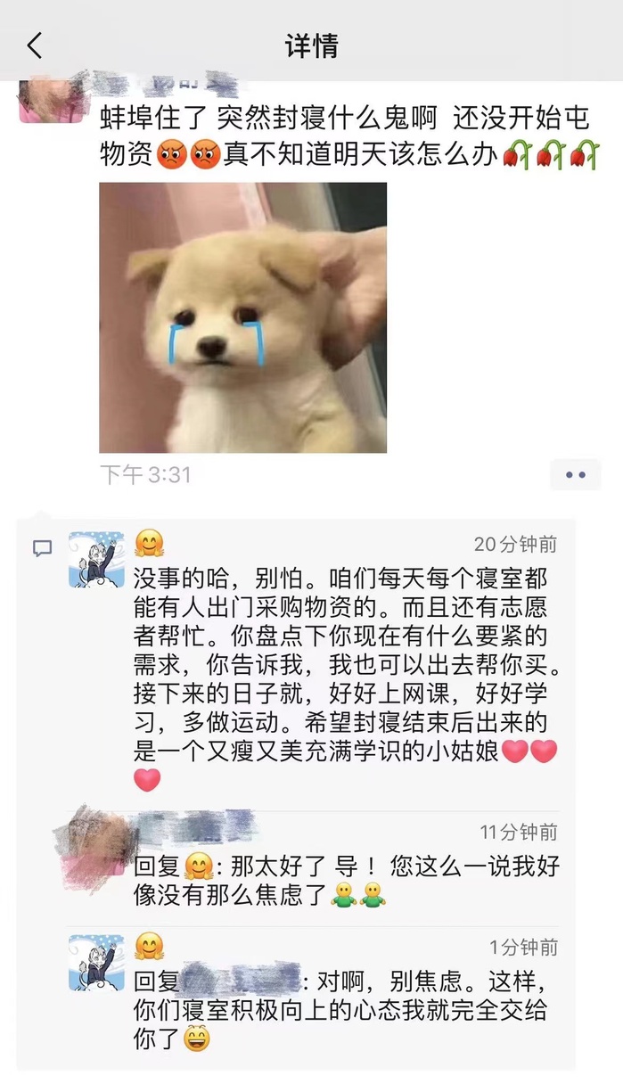 “没事的哈,别怕。你盘点一下有什么要紧的需求,你告诉我,我可以帮你买。接下来的日子里,就好好上网课,好好学习,多做运动。希望封寝结束后出来的是一个又瘦又美充满学识的小姑娘。”孙淼温暖的语言,及时快速的回复,让女同学马上又变回了开朗大方热情的姑娘。“太好啦,导!您这么一说我好像没有那么焦虑了!”她的回复让孙淼松了一口气,但为了让她真正的放下心理的负担,孙淼还交给了她一个任务,“你们寝室积极向上的心态我就完全交给你啦!”朋友圈里这温馨的一幕,不仅再次燃起女同学对生活的热情,更是让其他的同学也感受到了安心和温暖。