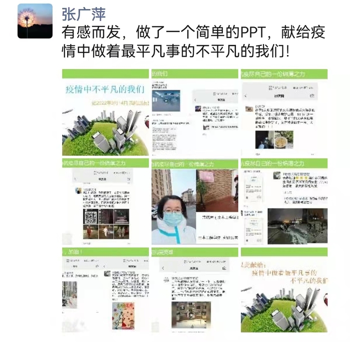 张广萍老师在朋友圈看到:有建设长春方仓医院,坚守在建筑岗位上的朋友;有参加社区志愿者,为全民核酸检测维持秩序,为已经完全封闭的小区居民采买生活物资的同事和毕业的学生;有通过网络在长春红十字会平台上捐款的在校生,他们都在为抗击疫情贡献自己的一份绵薄之力。张老师觉得有必要把这份感动和正能量传递下去。
