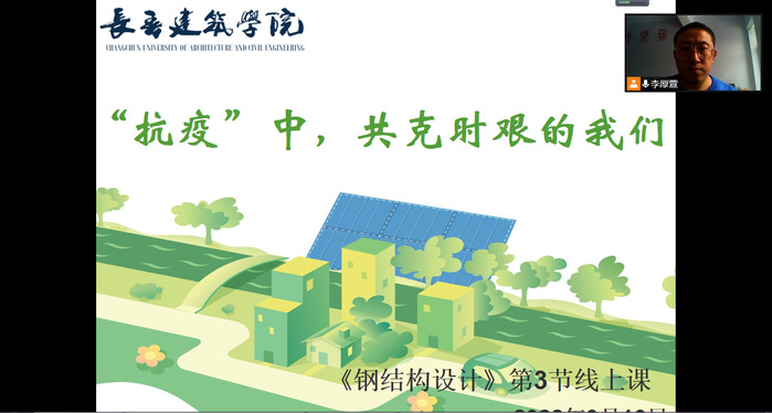 3月16日上午,学校土木工程学院钢结构教研室李厚萱老师在课程《钢结构设计》课前以《“抗疫”中,共克时艰的我们》为主题,对土木1901-1902班同学们进行了暖心问候及思政教育。