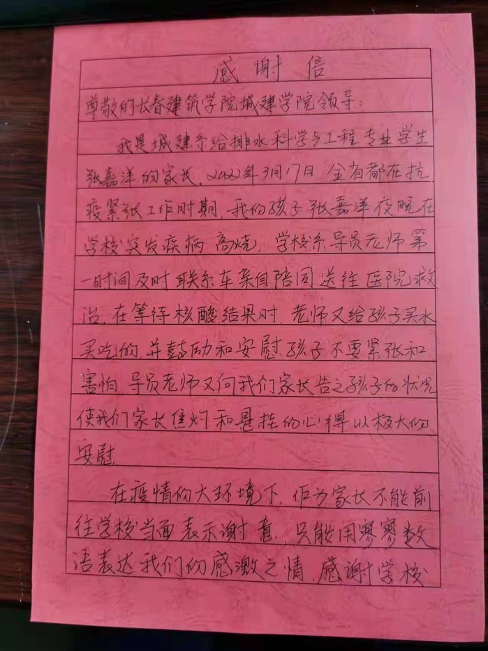 18日的凌晨,一夜无眠的杨女士终于等来了好消息,“孩子就是简单的感冒,医院给开了药,可以回去了。”这一夜,杨女士从史程程的身上感受到了长春建筑学院一直以来对学生的关怀与负责。“我为我的孩子能在这样的学校上学而感到开心,也感到放心。”杨女士不知道如何才能更好的表达自己的感激之情,便将自己的这份情感倾注在了感谢信中。