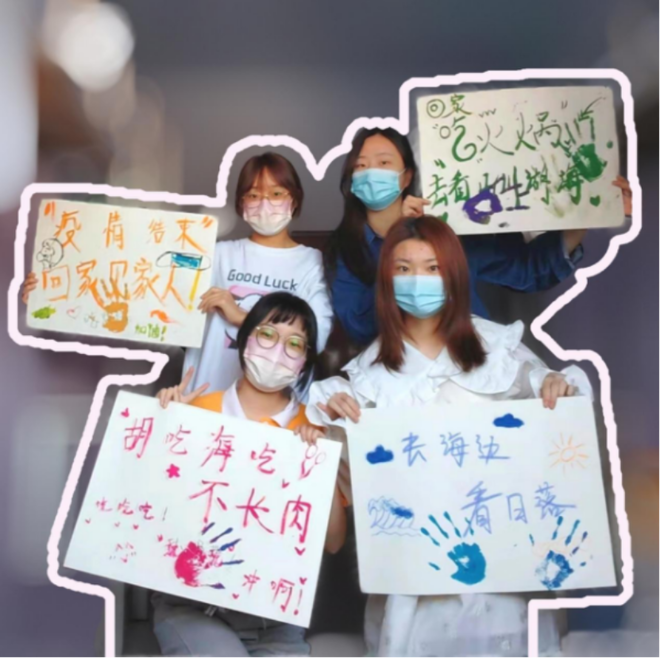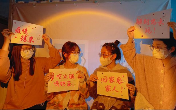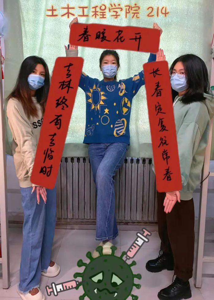 我们来自304寝室。疫情之下,我们每一个人都在与新型冠状病毒进行严峻的斗争。每天都处在封闭管控内的我们每时每刻都期盼着疫情快快结束。我们期待着盼望着在疫情结束后,娜娜请我们去吃火锅,娜娜带我们去吃蛋糕,娜娜带我们去吃海底捞!希望所有同学,静候春暖花开。到那时,我们相约美丽校园。