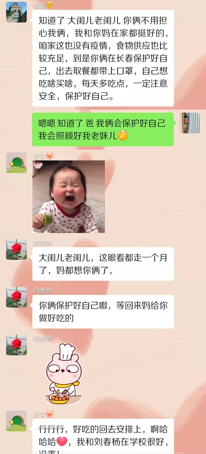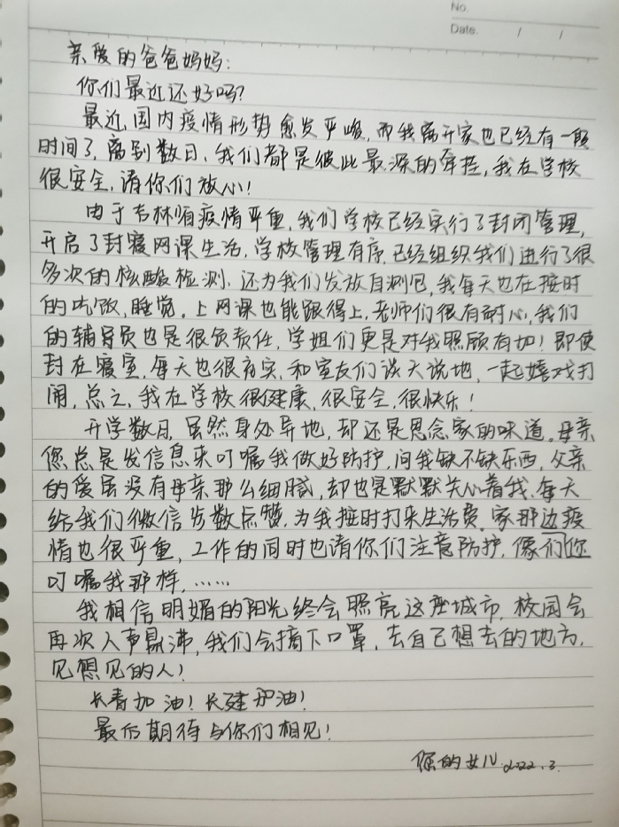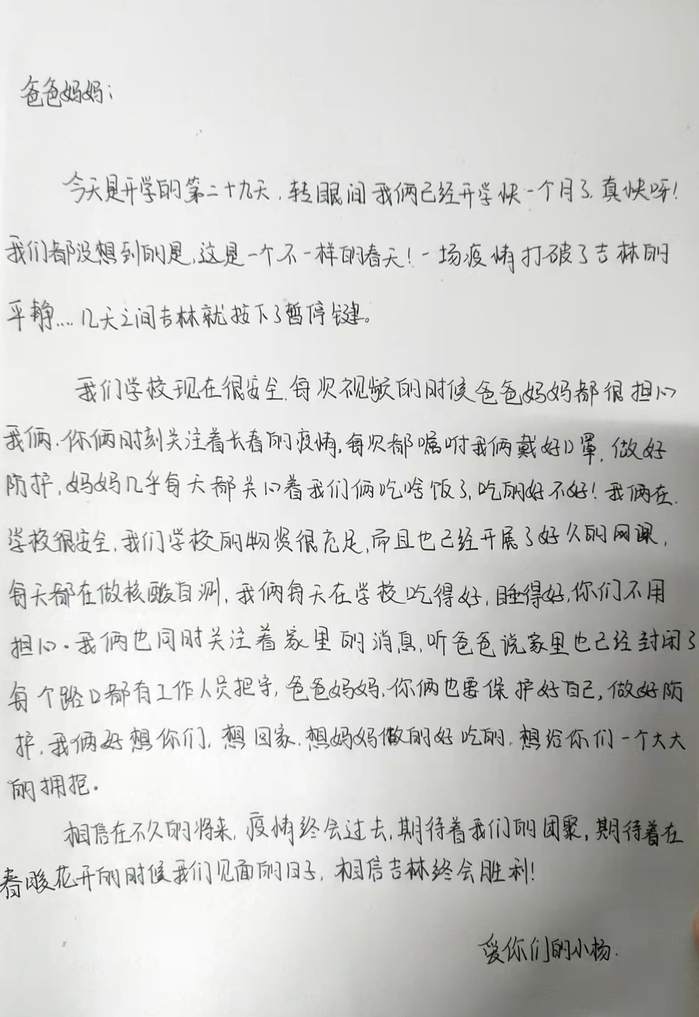 一母同胞两姐妹,一同考入了长春建筑学院管理学院,成为了同班同学。两人一同离开家乡,对于父母来说,思念是双倍的,疫情袭来,担忧也是双倍的,但当他们收到了两封同时寄来的家书时,那满满的幸福也是双倍的。