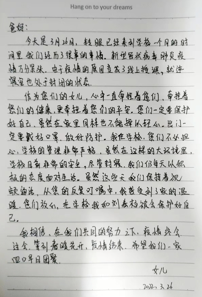 四个人的牵挂,四个人的惦念,汇聚成一个简单愿望:在你身边,你在身边。此时,姐妹相互陪伴,父母见字如面,内心甚安。