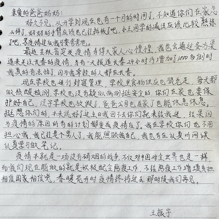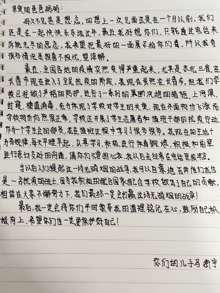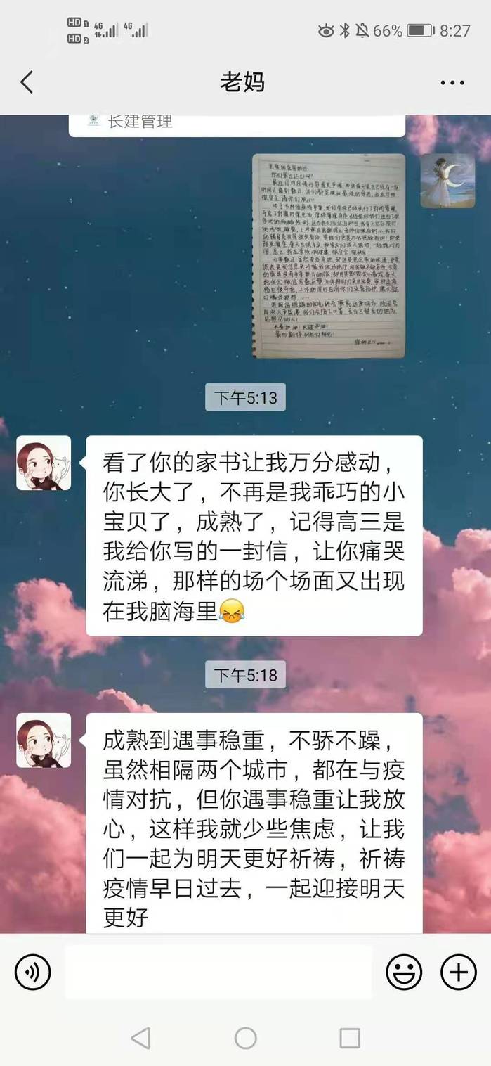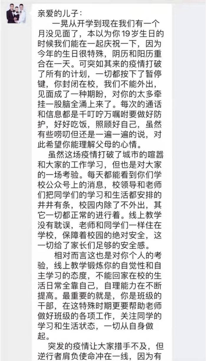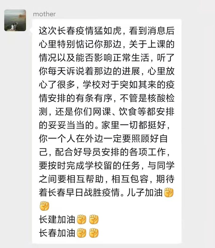 一封家书带去的不止是宽慰和安心,更多是让他们感受到了吾家有儿初长成的骄傲和自傲。面对疫情,长建学子能够勇当一面,而父母也会一直默默的站在长建学子的背后,与儿子一同战斗。冰雪已消融,暖意踏春来,万物皆在生长,长建学子也一样。