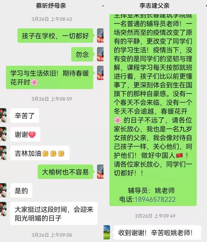 姚老师深知作为辅导员在抗疫攻坚的困难时期,更要充分发挥知心人、热心人和引路人的作用。为此,他经常与同学们互动谈心,组织文体活动,以此来安抚同学们的焦虑情绪。他化身Tony老师,为男同学设计发型;组织宿舍间的体育运动和电子竞技比赛;在微信群中和同学们聊天谈笑,还时常以微信抢红包的方式,调节大家的情绪,舒缓了同学们紧绷的神经。同时他以学院的心理工作室为依托,建立起学院心理委员工作群,积极关注每一名学生的心理健康,告诫每位同学都要主动防护,有效应对,面对疫情要理性对待,不轻视、不恐慌。帮助学生以自信乐观的心态面对困难,做一名生命健康的守护者、认真笃学的修行者,游必有方的识途者。他还写下了《致家长的一封信》,安抚了家长们的担忧情绪,为家校之间、师生之间搭建起良好沟通的桥梁。
