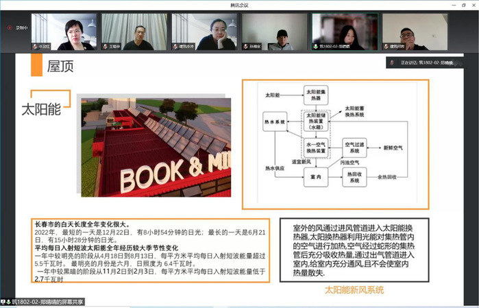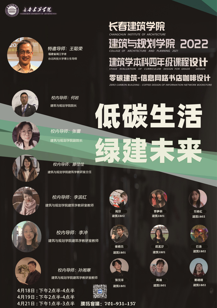 长春建筑学院建筑与规划学院继“绿色建筑专题之设计方法的运用”、“长春建筑学院校园内既有建筑改造”两次与台北科技大学博士生导师王聪荣教授“云端相约”后,再次展开为期三天的“零碳资讯-网络咖啡书店设计”云评图活动。