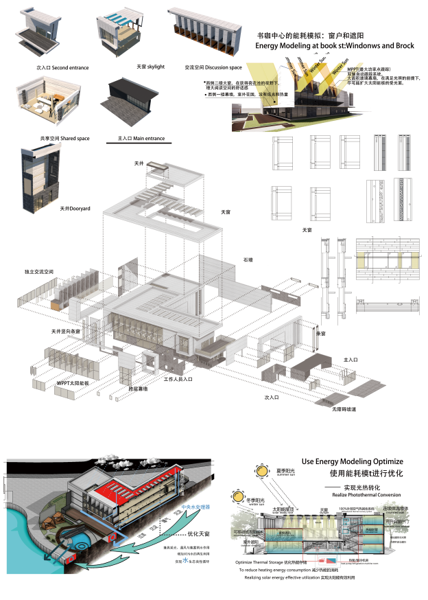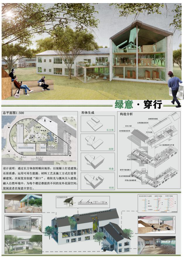方案介绍:本次的设计将绿色环保和建筑相结合,建筑的内部,建筑外观小品和窗户都进行了绿色环保处理,在减少能源的情况下最大的对建筑进行建造,建筑的内庭院可以形成自己的微气候,并为读者提供更多的半开放空间,更好的融入于自然之中。在空间形体上也进行了更多的造型,让建筑内部有更丰富的光影。