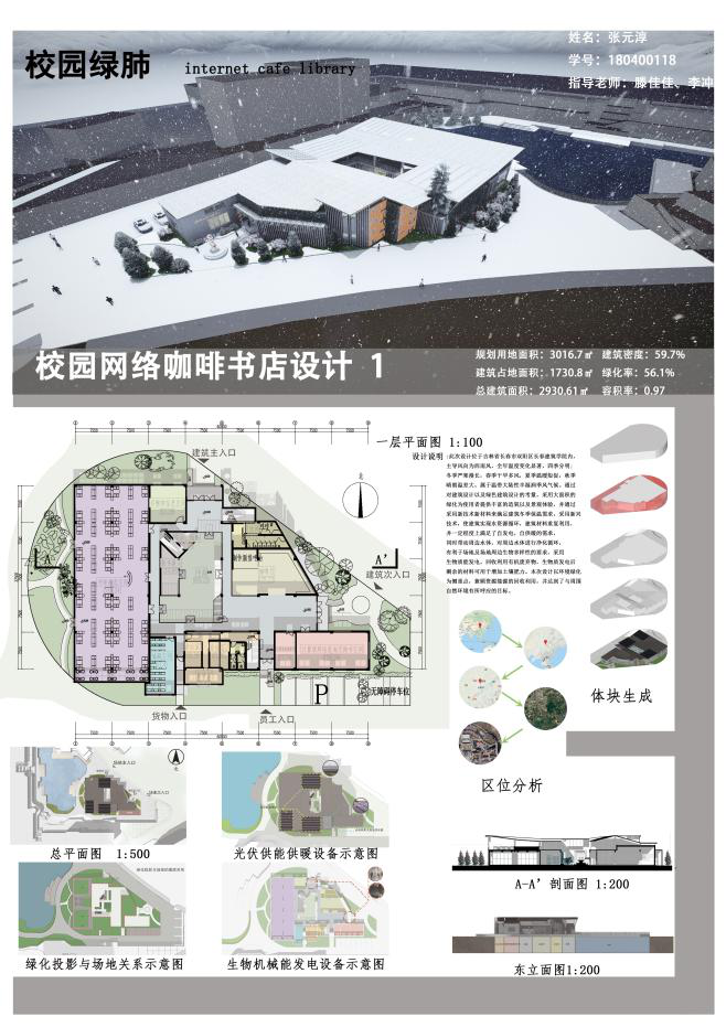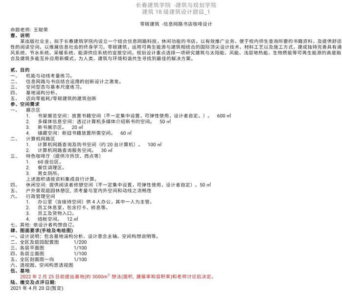 本次设计项目选址在长春建筑学院奢岭校区,任务书为《零碳资讯网络咖啡书店设计》,要求以便于校内师生查询所需书籍,拥有舒适、现代、休闲的阅读空间,设立一个结合信息网络科技、具有休闲功能的书店。