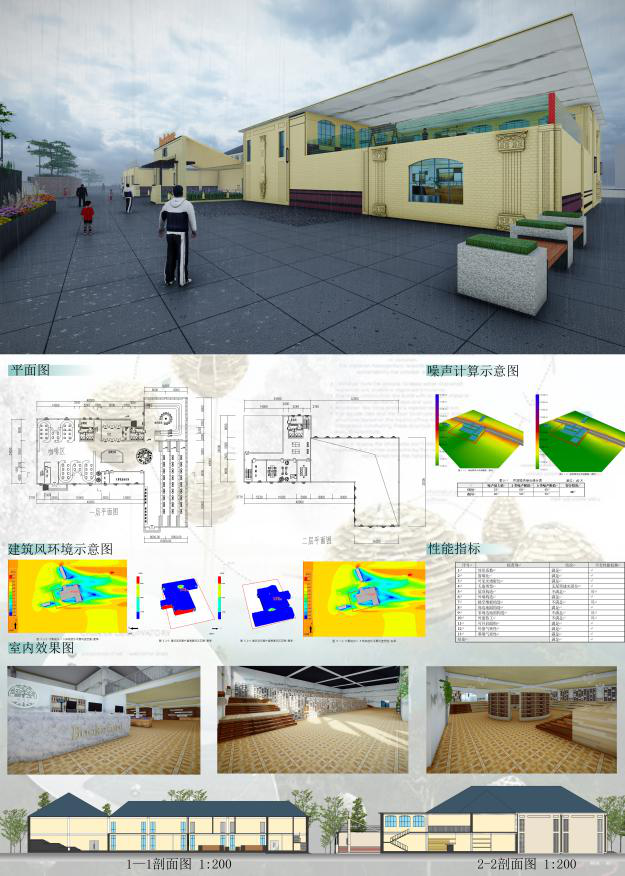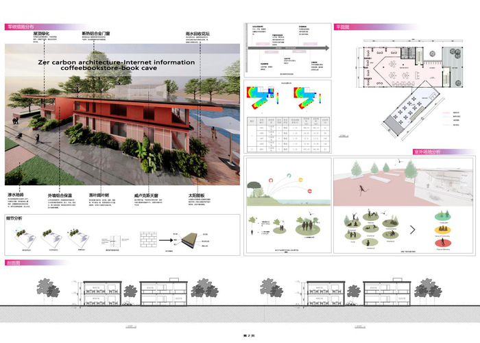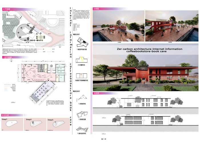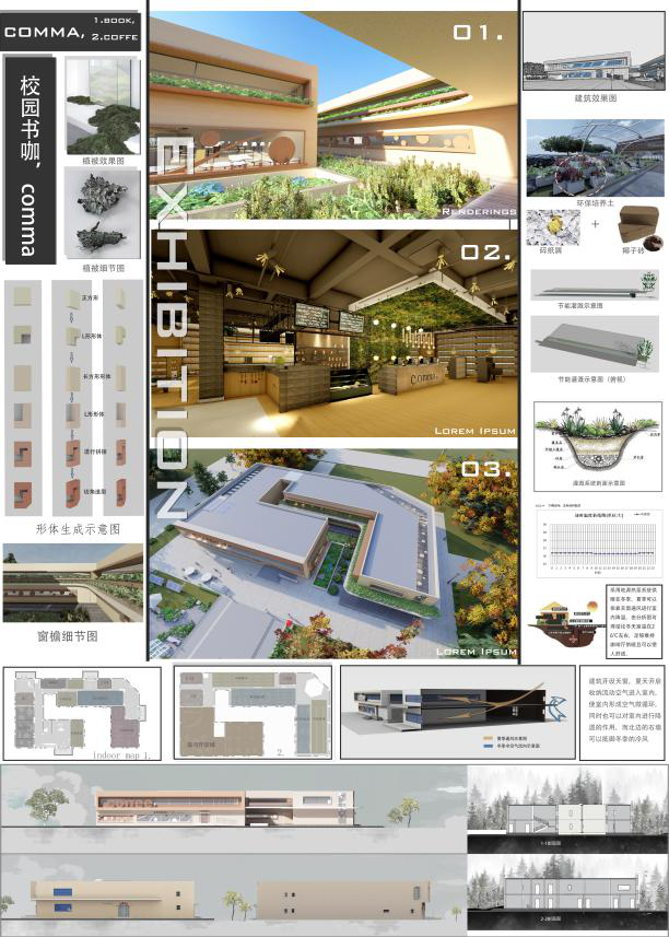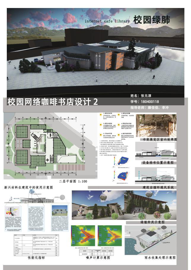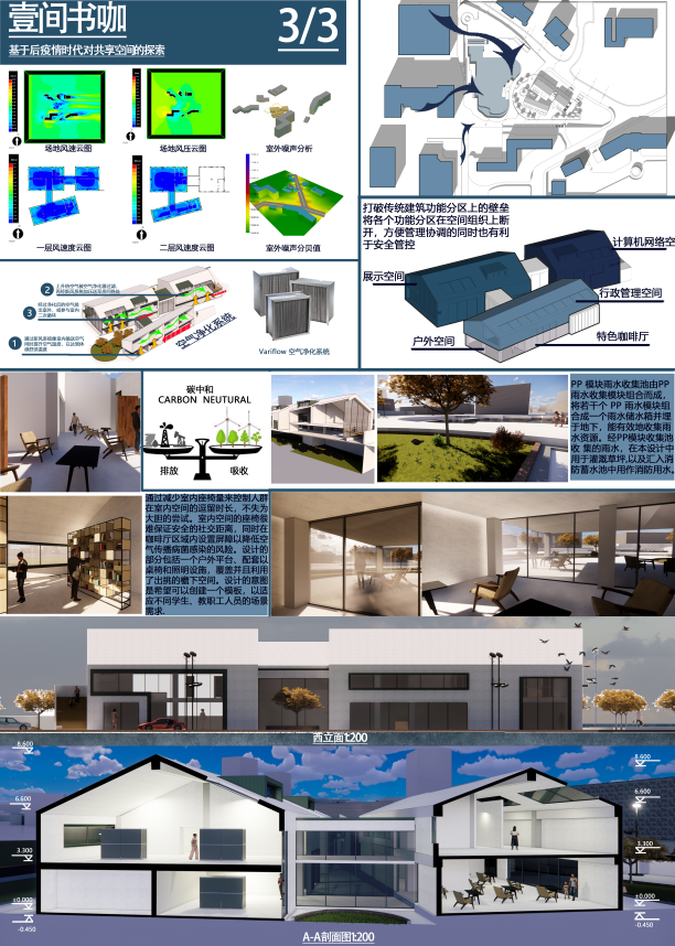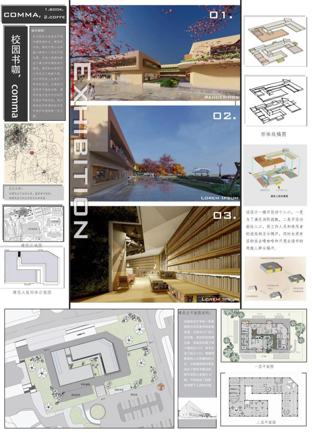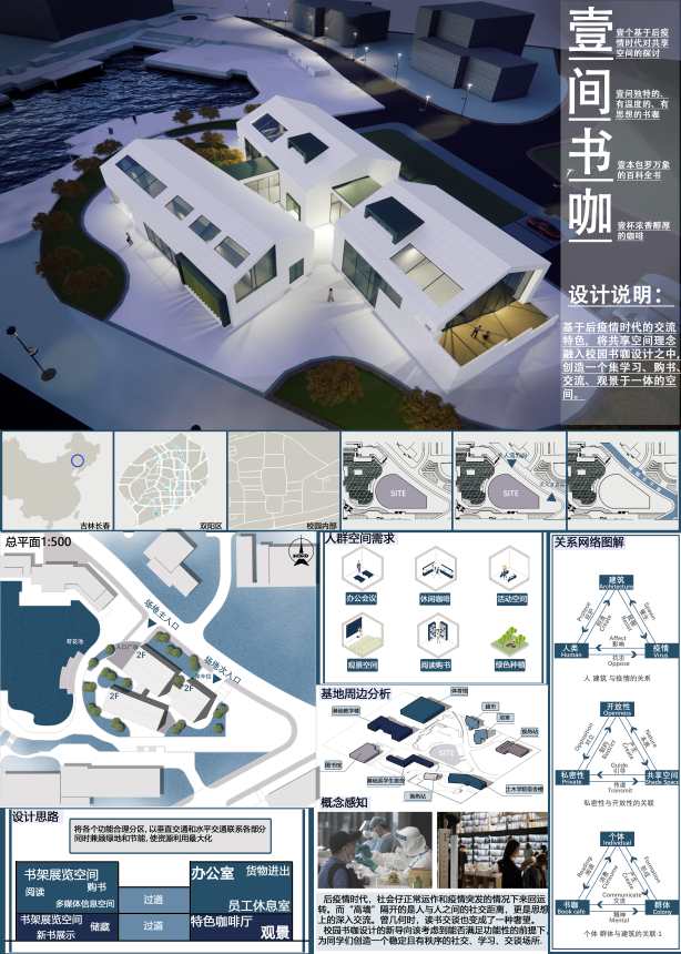 方案介绍:基于后疫情时代与绿色建筑的设计特色,将共享空间理论融入校园主咖设计中,创造一个集学习、购书、交流、观景于一体的空间。