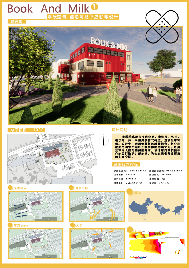 方案介绍:集装箱式复合书店空间,集购书,休闲,餐饮与一体,采用集装箱式构造,不仅可回收再利用,同时减少了其他建筑材料的使用量,施工阶段也更加环保。设计中,运用集装箱的堆叠组合,切割出敞亮的图书空间以及较安静的阅读空间,以满足不同人群对空间的需求。设计意向在校园中心地段打造活力新地标,为师生提供舒适惬意的共享空间。