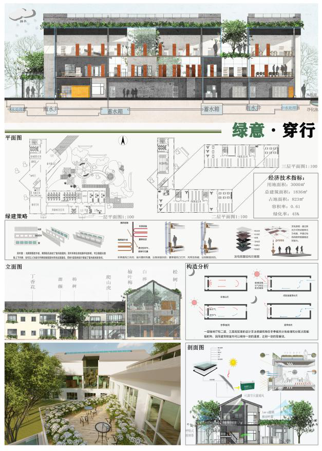 点评:方案的立意和寓意很好,图面整体呈现也非常详细清晰。建议建筑的主要配置空间要面向主要干道,考虑管线等设施的引入。建筑的内部要有开放空间与室外设计微空间进行过度,与室外环境有缓冲,虚实空间要有充分的联系,当建筑体量较大时,不要将内部空间做的过于封闭。