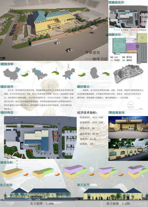 方案介绍:本设计建筑部分为四个区域,阅读区、咖啡区、计算机网络区、办公区。力求设计欧式建筑风格,与地块周边环境相统一。充分利用自然界的太阳能、风能、雨水回收等建筑方法为内部提供电能、生活用水,并考虑了自然通风,日照,交通等重要因素,减少能耗,降低资源输入,达到与自然环境和谐共生的目标。