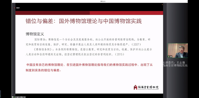 王志强馆长主要从博物馆准入制度偏差、博物馆理事会制度错位、博物馆公共性与博物馆运营内循环现象这三个方面为大家讲述,这些问题对未来博物馆都是一个挑战。我们需要向中国传统文化寻找自治基因,寻求理论突破,进而实现制度创新。