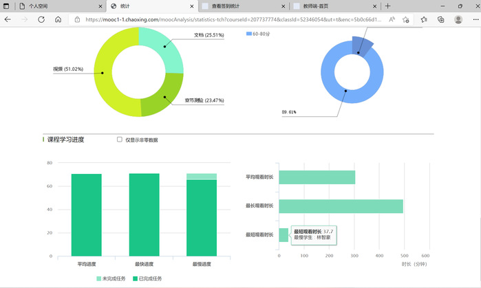 (四)利用数据评价。通过平台数据分析,可以实时掌握学生课前完成任务情况、在线听课情况、课后作业测验的情况等,将学生学习行为等成绩直接计入学习通综合成绩当中,完善成绩考核体系。