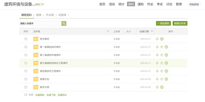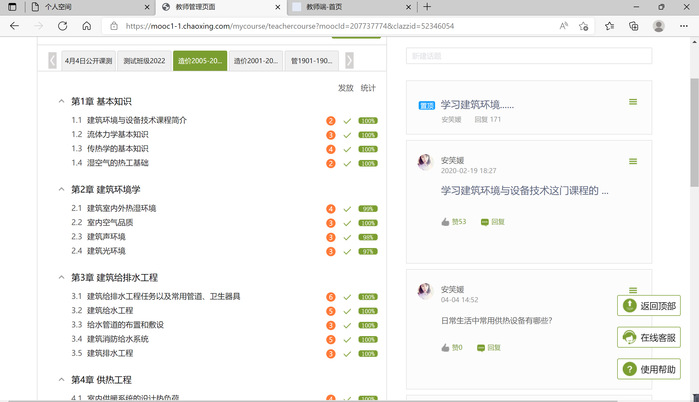 为保证线上教学顺利有序进行,引用超星尔雅、中国慕课等优质网络资源(如图所示),以超星学习通为主要教学平台搭建自由资源,形成综合性专业课程资料库,补充学习内容,拓宽学生视野,激发学习兴趣。开课前按照“四结合”的原则对课程资源进行组合,即学科专业普遍需求和学生学情个性化需求相结合,有声资源和无声资源相结合,学习通平台与聊天工具互动群相结合,学生静态自主学习与师生动态互动相结合。根据《建筑环境与设备技术》课程特点合理的推荐适合工程造价专业学生的学习资源,在多样化的教学资源中吸取精华,有选择性地将教学资源充实于课堂教学,学生的视域将更加宽广,其专业能力、思维和情感必将得到多方面的滋养和锻炼。