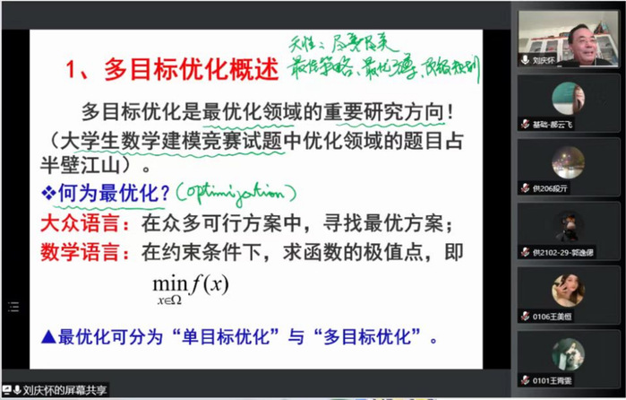 刘庆怀教授利用近2个小时的时间向师生们展现多目标优化在数学建模中的应用,形象生动地讲解适用于多目标优化的生活中遇到的实际案例,从发现问题,深入研究问题,再到解决问题,三个维度来深化学生对多目标优化概念的理解,让同学们对多目标优化在数学建模中的应用有了进一步的认识。刘教授还围绕学生关心的数学建模热点,与同学们进行了交流,对同学们提出了殷殷期许。报告深入浅出,同学们受益匪浅。
