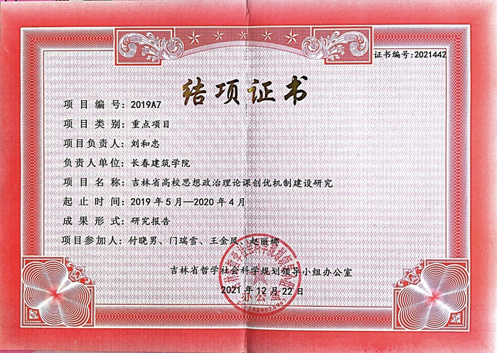 近日,长春建筑学院原校长刘和忠教授主持的吉林省社科基金重点项目“吉林省高校思想政治理论课创优机制建设研究”,经审查,予以结项。