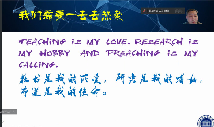 杨阳老师分别从学科与课程发展史、跨学科与发散思维等方面,以案例为基础,通过多样化的引证及辩证思考,用科研的视角探索在教学中课程思政的切入点,导出学科历史与学生兴趣探索二者结合的规律,并结合本专业的情况,从方法形式入手,引发教学中的专业教育+思政教育的方式方法思考问题。在研讨中,杨阳老师总结了在思维层面引导新工科与各个学科结合的新思路,同时,他也指出多学科背景下,大量的工程实践细节难题引发的个人思考,并以部分工科知识为教学范例,展示如何将信息技术以更加诙谐幽默的方式助力线上课堂。杨阳老师的研讨思路别出心裁,充分体现跨学科主题的内涵和应用形态,充满趣味、引人入胜、深入浅出地展示了智能时代下跨专业学科专业教学的多向性思考,具有高度的学术价值及教科研经验价值,也为参会教师提供了不拘一格的学术研讨形式和思考路径。