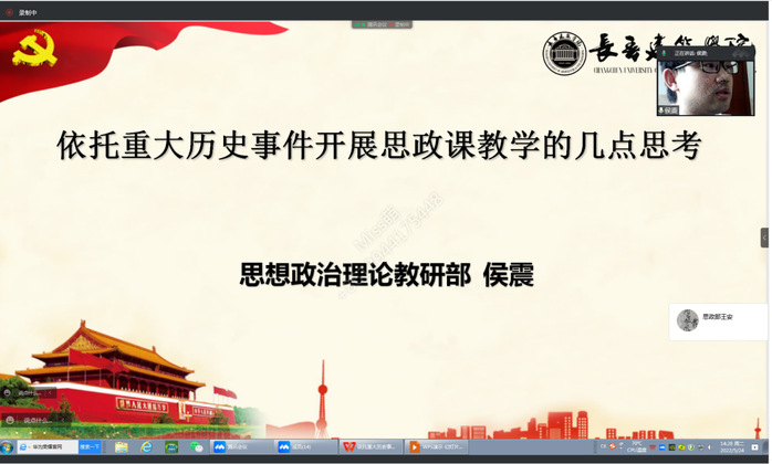 侯震老师以《依托重大历史事件开展思政课教学的几点思考》为题,分享了自己在教学实践中将重大历史事件融入思政课教学的实践路径。侯老师在教学过程中,注重发挥重大历史事件在思政课教学中的价值,将重大历史事件与当代大学生心理特点和所学专业相结合,收到了比较好的教育教学效果。