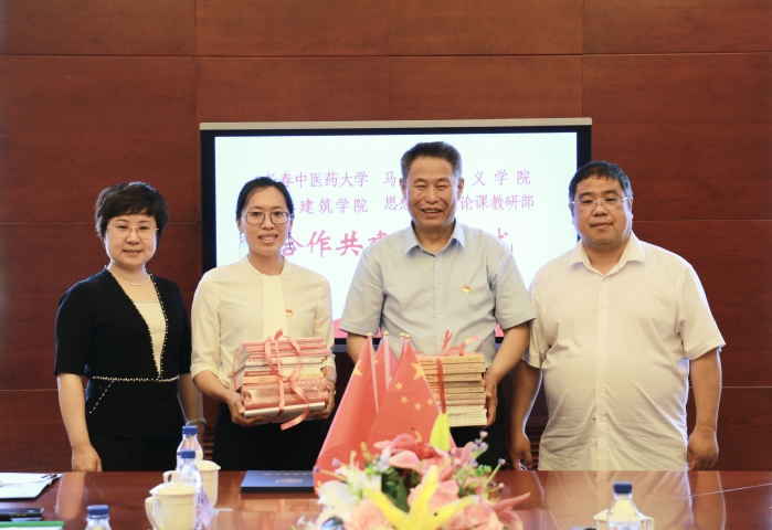 徐永军、付晓男副院长代表长春中医药大学马克思主义学院向学校赠送了马克思主义理论学科前沿图书资料。思政部主任叶万军、副主任赵丽娜代表思政部接受了赠书。