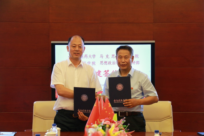 为了充分发挥马克思主义学院学习研究宣传马克思主义主阵地作用,坚持用习近平新时代中国特色社会主义思想铸魂育人,切实办好思想政治理论课,学校思想政治理论教研部与长春中医药大学马克思主义学院于6月16日下午在图书馆会议室签署共建协议。校长张兴海、党委书记王宝龙、党委副书记、副校长王玫出席签字仪式。长春中医药大学马克思主义学院党委书记徐德斌、副院长徐永军、副院长付晓男、办公室主任姜浩等一行4人前来学校参加签字仪式。