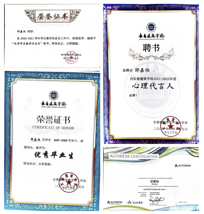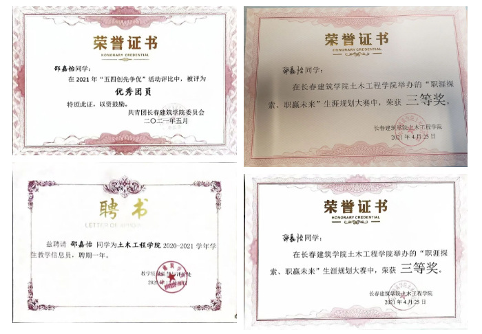 2021年4月获吉林省大学生职业生涯规划大赛院级三等奖;