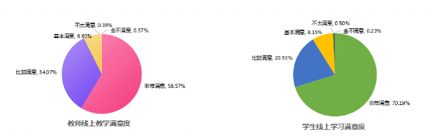 学校形成“点面结合”的在线教学反馈方式,通过督导对教师、学生对教师的点对点反馈,校级督导对学院阶段性点对面的反馈,及时高效地促进教师在线教学质量的提升。学校通过网络调查,并通过多维度数据分析,形成系列在线教学督导报告,为在线教学效果持续改进提供依据;在对学生学习效果的调查中,学生对线上学习满意度达99.27%,学校在线教学取得了良好的成效。
