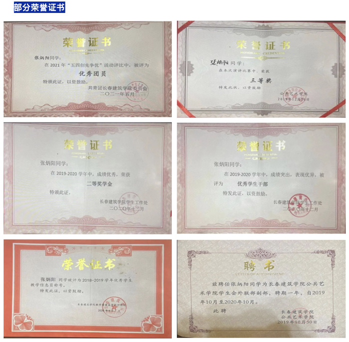 2018-2021年间多次获得公共艺术学院三好学生、优秀班级干部等荣誉称号。