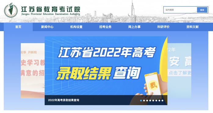 1.请家长及考生,搜索考生所在地的教育考试院网站进行查询。以江苏省为例,搜索“江苏省教育考试院”,点击进入江苏省2022年高考录取结果查询页面。