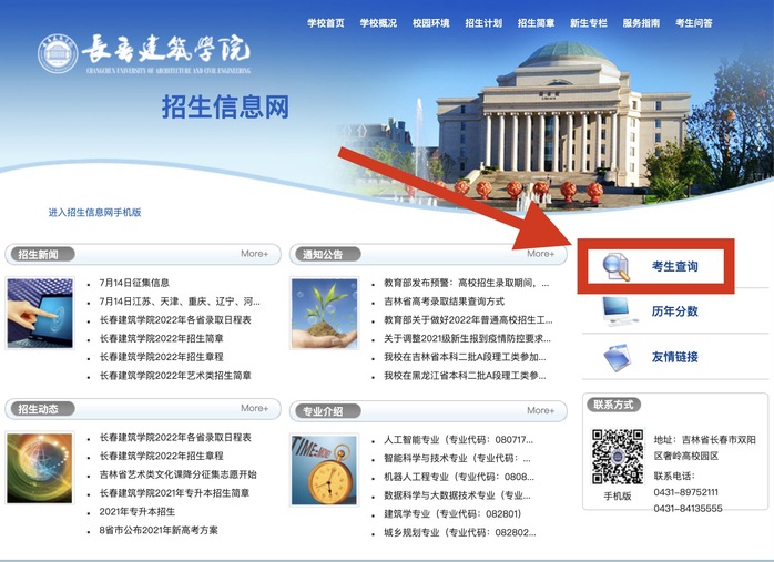 1.打开长春建筑学院招生信息网(http://zhaosheng.jladi.com/),点击“考生查询”,进入“长春建筑学院录取查询系统”。