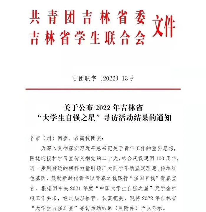 吉林省“大学生自强之星”寻访活动由共青团吉林省委、吉林省学生联合会共同主办,旨在深入贯彻落实习近平总书记关于青年工作的重要思想,围绕迎接和学习宣传贯彻党的二十大,结合庆祝建团100周年,进一步用身边的榜样力量引领广大同学不断坚定理想、传承红色基因,鼓励新时代青年以青春之我践行“强国有我”青春誓言。
