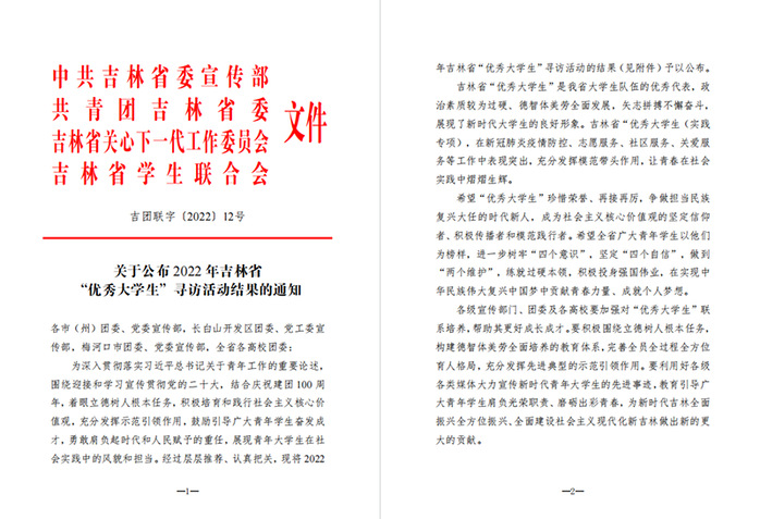 由中共吉林省委宣传部、共青团吉林省委、吉林省关心下一代工作委员会、吉林省学生联合会共同开展的2022年吉林省“优秀大学生”寻访活动结果揭晓,学校城建学院建筑电气与智能化专业1802班王贺正、管理学院工程造价专业2001班王惊哲荣获2022年吉林省“优秀大学生”称号,城建学院给排水科学与工程专业2002班韩涛荣获2022年吉林省“优秀大学生”(实践专项)称号。