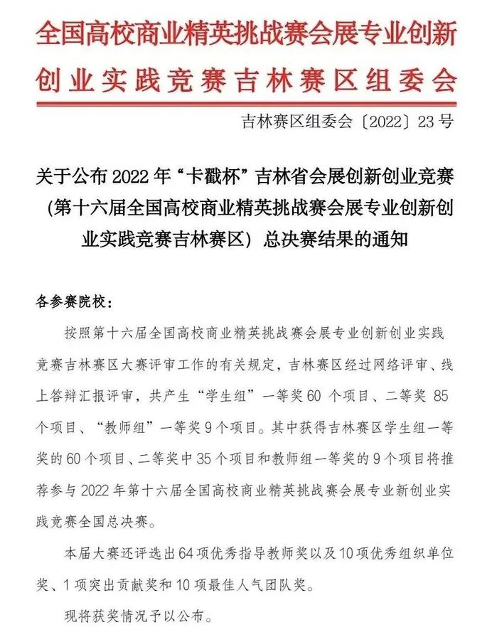 10月8日,2022年“卡戳杯”吉林省会展创新创业竞赛(第十六届全国高校商业精英挑战赛会展专业创新创业实践竞赛吉林赛区)总决赛成绩新鲜出炉。来自学校文化创意产业学院的8支学生参赛团队摘得本科组一等奖3项、二等奖5项的优异成绩,其中4支学生团队入围全国总决赛,学校获吉林赛区优秀组织单位奖。