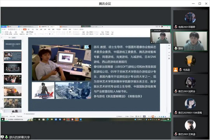 邵兵是中国图形图像协会数码艺术委员会委员、吉林艺术学院新媒体学院游戏娱乐系主任。报告会中,邵兵以视频、图片形式生动地为同学们展现了优秀游戏片段,新颖精彩引人入胜的游戏,激发了同学们浓厚的兴趣。邵兵还向同学们介绍了他曾经任职的法国育碧(UBISOFT)游戏公司和台湾昱泉国际游戏公司,回顾了他在2005年于吉林艺术学院创办游戏设计专业的历程。