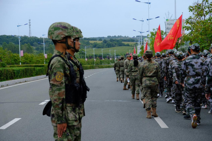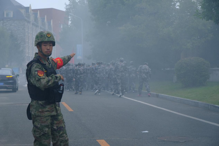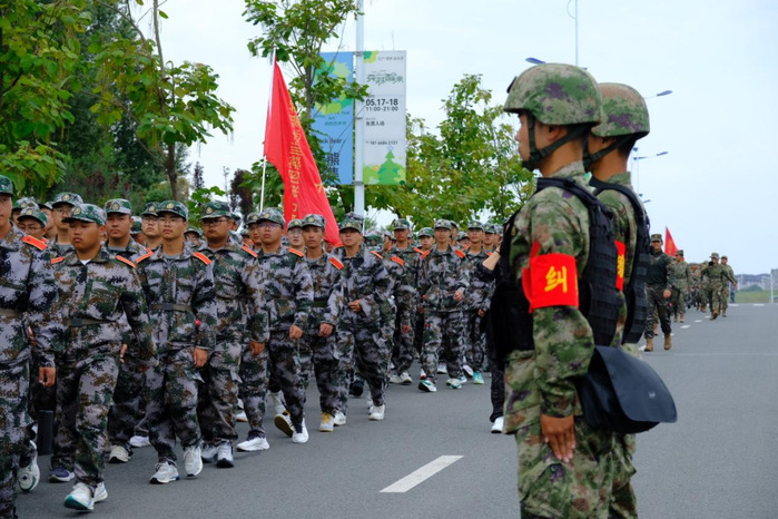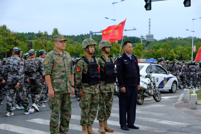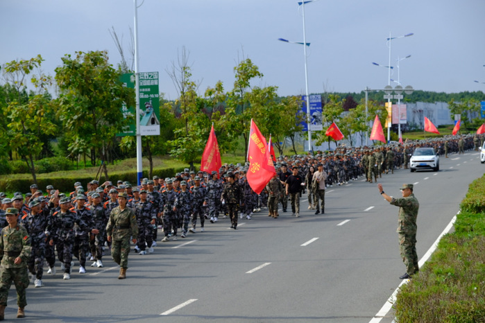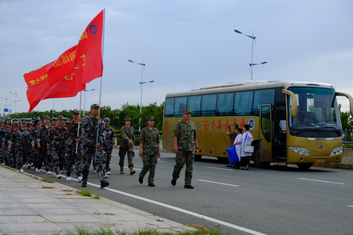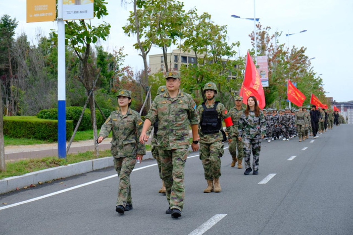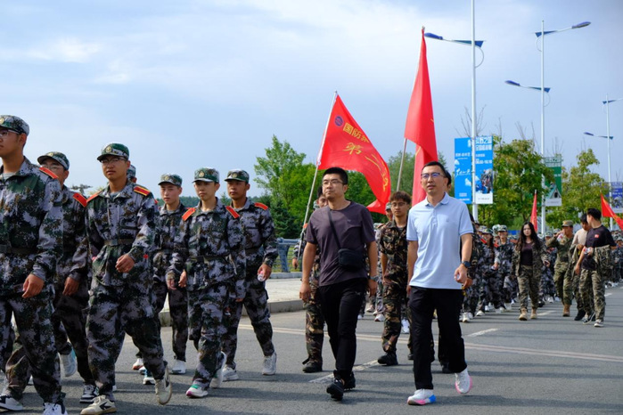 行进过程中,各梯队展现出顽强斗志。前段路程,新生们精神饱满,《强军战歌》的歌声响彻沿途;遭遇坡度路段,呼吸逐渐急促,但无人掉队,大家相互提醒,保持队形稳步前进;后段进入体力消耗极限阶段,同学们肩并肩,用“再坚持一下”的信念相互支撑。最终,两支梯队按照预定计划,在校外指定会师点成功汇合。