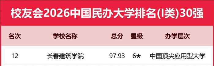 1月12日,全国第三方大学评价机构艾瑞深校友会网正式发布校友会2026中国大学排名,长春建筑学院以97.93分荣居中国民办大学排名(I类)第12名,稳居中国顶尖应用型大学前列。