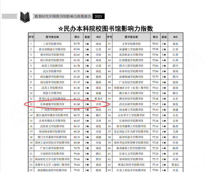 近日,武汉大学中国科学评价研究中心、数字出版智能服务技术教育部工程研究中心联合研制的权威报告——《数智时代中国图书馆影响力指数报告(2025)》正式发布。学校图书馆在本次评价中表现亮眼、成果卓著,以 81.08 分综合影响力指数跻身全国民办本科院校图书馆第十二,同时跃升吉林省同类院校第一名。