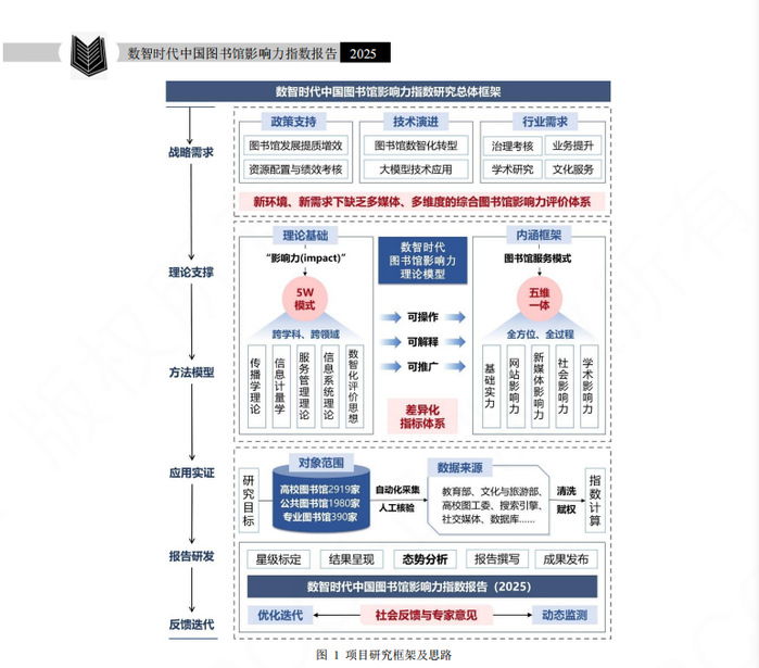 此研究是承接《中国图书馆网络影响力评价报告(2023-2024)》和《数智时代中国图书馆影响力评价报告(2024)》开展的第三次全国图书馆影响力研究,遵循“战略需求—理论支撑—方法模型—应用实证—报告研发—反馈迭代”的思路展开。战略需求侧重梳理文化强国、科教兴国等国家战略要求,以及开放科学与新型网络环境带来的现实需求;理论支撑围绕国内外相关研究现状,梳理影响力的分类标准、测度原则与评价导向;方法模型聚焦数智技术驱动下的指标体系与分析模型构建;应用实证是指依托“资源—技术”优势,对国内图书馆开展分类、多维的影响力实证分析;报告研发聚焦指数报告的撰写与发布,为学界、业界、馆界以及管理部门提供参考依据。